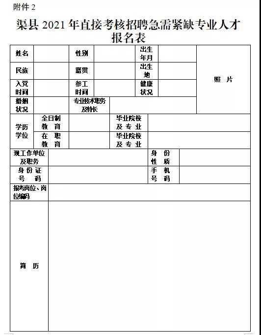 2.渠縣2021年直接考核招聘急需緊缺專業(yè)人才報名表